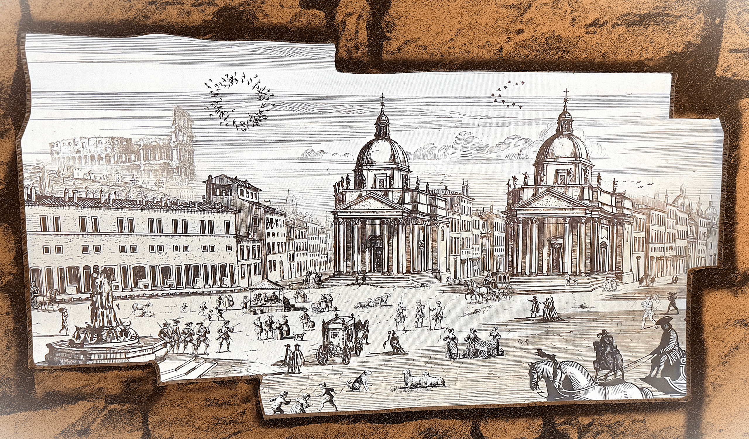 Eine Wimmelbild-Animation im Stil historischer Radierungen. Die Piazza del Popolo in Rom, Anfang des 18. Jahrhunderts: Per Berührung werden Tiere, Passanten und Kutschen im Bild lebendig und erzählen viele kleine Geschichten.